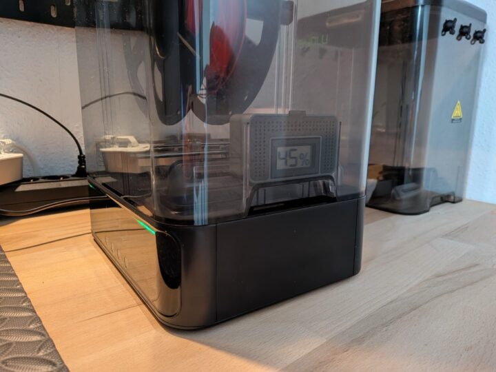 Der erste Eindruck des SUNLU SP2 ist durchaus ansprechend. Das Gerät präsentiert sich in einem modernen, stapelbaren Design, was besonders in kleineren Räumen oder bei allgemein begrenztem Platzangebot von Vorteil sein kann. Im Inneren des Trockners sorgt ein integriertes Hygrometer für die Überwachung der Luftfeuchtigkeit.
