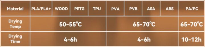 Die hier abgebildeten Zeiten stellen die idealen Trocknungszeiten laut Hersteller dar und spiegelt auch die entsprechenden Profile wider, die im Gerät bereits hinterlegt sind. Über das Display lassen sich diese Werte aber allesamt anpassen, kennt man so auch von allen anderen Trocknern des Unternehmens. In meinen Tests funktionierte das Trocknen der Filamente (hier PETG, ABS und ASA) dann anscheinend auch genauso zuverlässig wie mit dem S4 und meinem alten S2, zumindest, wenn man sich die abschließende Qualität der gedruckten Modelle anschaut.