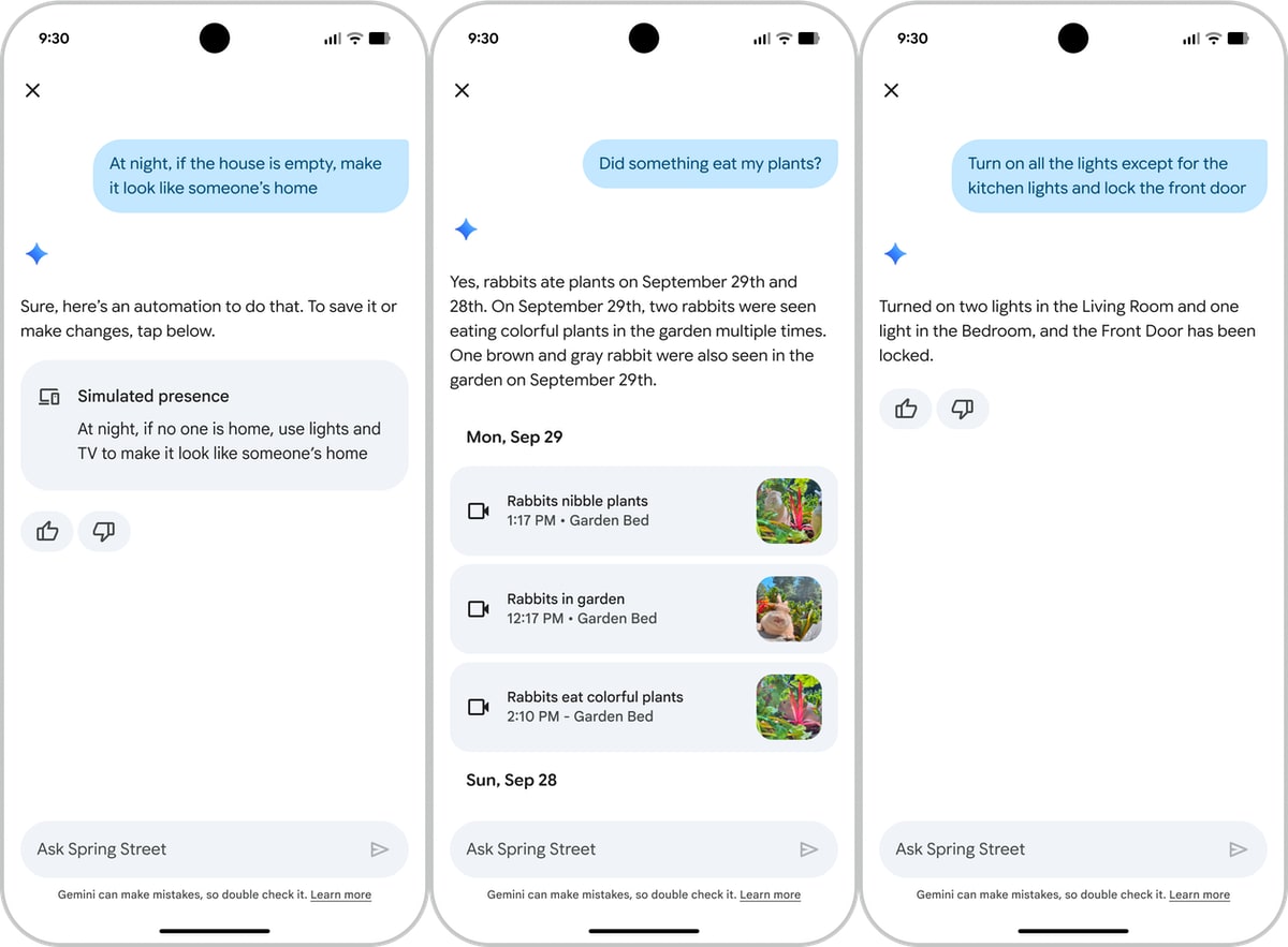 KI-Unterstützung gibt es dank Gemini for Home auch für (ältere) Kameras aus dem Nest-Lineup. Zu den Gemini-Funktionen zählt die Möglichkeit detailliertere, beschreibende Benachrichtigungen zu erhalten (z. B. „Der Hund springt aus dem Laufstall.“). Mittels Ask Home kann man in natürlicher Sprache Fragen zum Videoverlauf stellen und eine Ereignisbeschreibung mit relevanten Videoclips erhalten. Home Brief erstellt gar Zusammenfassungen zu stundenlangem Videomaterial.