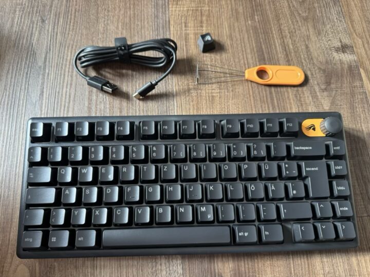 Wie gewohnt kommt die GMBK 75 % in der Box im typischen Glorious-Look. Weiß, Orange und das markante Glorious-Profil prägen das Aussehen. Beim Auspacken fällt auf, dass trotz des Preises nicht an Schutz gespart wird: Schutzpapier, Papprahmen, alles sauber gesichert. Im Karton liegen neben der Tastatur ein abnehmbares USB-C-Kabel (gummiert, schön flexibel), ein Keycap-Puller samt Austausch-Tool und ein Glorious-Sticker. Die Dokumentation ist knapp, aber ausreichend. Am Ende ist es schließlich “nur” eine Tastatur.