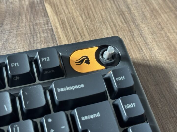 Für den einen oder anderen sicher wichtig: Die IP57-Zertifizierung. Die GMBK 75% nimmt Staub und Spritzwasser gelassen. Sie kann also auch mal im Chaos überleben oder beim Snack am Schreibtisch dabei sein. Der umgeschüttete Energy-Drink Das abnehmbare USB-C-Kabel bietet Flex; die Verbindung zum Rechner bleibt stabil. Toll: Die Lautstärkeregelung kann man nicht nur drücken, sondern nach Wunsch gegen Alternativdesigns anpassen.
