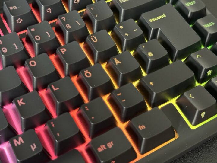 Wie sieht es unter den Caps aus? Dort stecken keine mechanischen Schalter, sondern spezielle, MX-kompatible Membran-Switches. Das heißt: Das Tippgefühl ist weicher und weniger knackig als bei mechanischen Keyboards. Dadurch ist die Lautstärke aber deutlich leiser. Es gibt keinen metallischen Hall und kein Klappern oder Klacken. Damit ist sie ein guter Kandidat für das Büro oder das Homeoffice. In puncto Präzision muss man aber etwas Abstriche machen. Die Tasten lösen schwammiger aus, als etwa die mechanischen Switches der anderen Glorious-Modelle. Für Gelegenheitsspieler, Office und Alltagsnutzung reicht es meiner Meinung nach aber vollkommen aus.