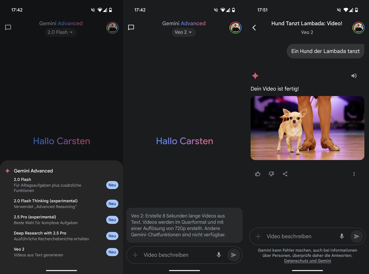 Interessant ist dieser Schritt vor allem vor dem Hintergrund des wachsenden Marktes für KI-generierte Inhalte. Google positioniert sich damit strategisch im Wettbewerb um die Vorherrschaft bei generativer KI. Während bisher hauptsächlich Text- und Bildgenerierung im Fokus standen, öffnet die Videogenerierung neue Möglichkeiten für kreative Anwendungen. Wichtig zu wissen: Die Erstellung dauert immer ein bis zwei Minütchen und ist nicht immer ganz passend (hier mein Beispiel).