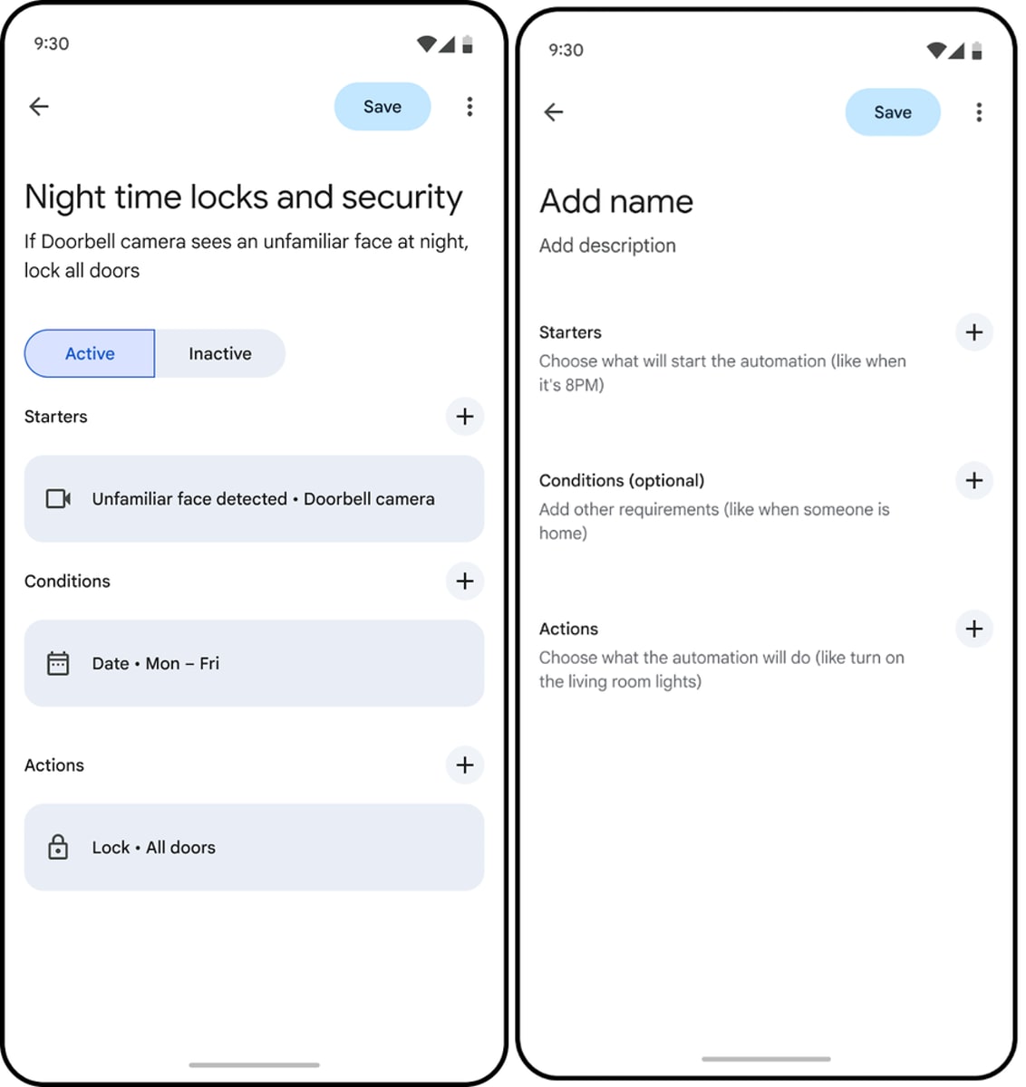 Der Zugriff auf den neuen Editor erfolgt direkt über die Google-Home-App. Nach (bzw. mit) dem Erstellen einer Automation können Nutzer ihrer Automation einen Namen und optional eine Beschreibung geben. Anschließend lassen sich Auslöser, Bedingungen und Aktionen festlegen. Zu den neuen Funktionen gehören auch Benachrichtigungen an bestimmte Personen oder den gesamten Haushalt sowie die Möglichkeit, Automatisierungen stündlich, monatlich oder jährlich auszuführen.