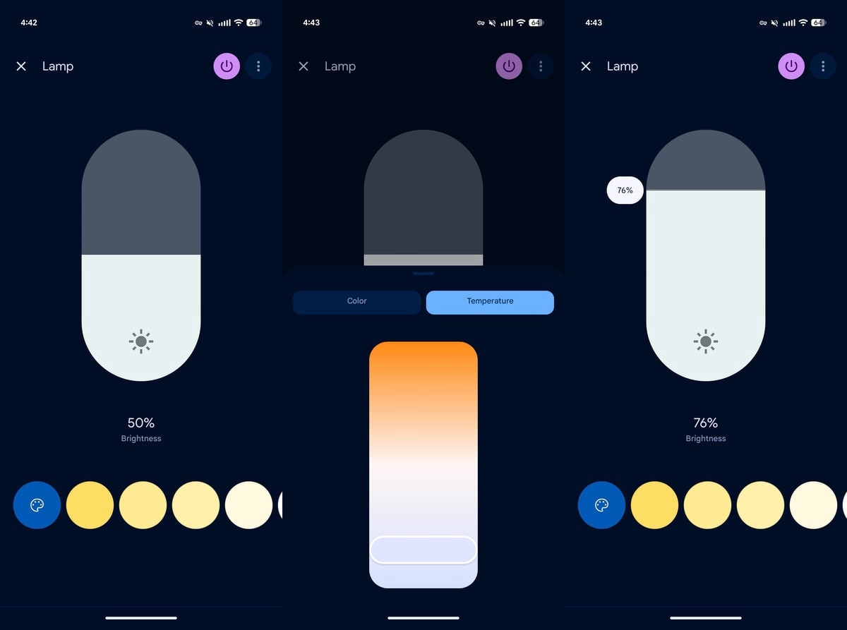 Bei smarten Lampen bleibt der große pillenförmige Schieberegler erhalten, allerdings wandert die Prozentanzeige nach unten. Wer die Helligkeit anpasst, bekommt jetzt haptisches Feedback und sieht die Prozentzahl zusätzlich links eingeblendet. Ein Antippen des Schiebereglers schaltet die Lampe nicht mehr ein oder aus, sondern passt direkt die Helligkeit an. Dafür gibt es jetzt einen klassischen Power-Button oben rechts. Im ausgeschalteten Zustand wird der Container zu einem abgerundeten Rechteck.