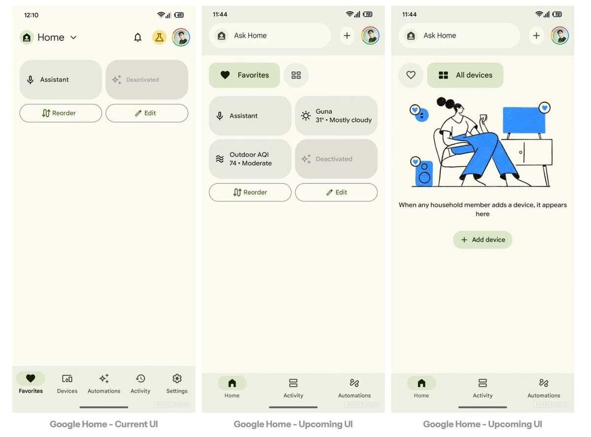 Die auffälligste Neuerung ist die Umbenennung des „Favoriten“-Tabs in „Home“. Die Benutzeroberfläche wurde entrümpelt, die Einstellungen, der Posteingang und die Labs-Funktionen wandern in den Account-Switcher. Auch die Geräte- und Einstellungs-Tabs verschwinden. Stattdessen gibt es einen neuen Grid-Button für den Zugriff auf alle Smart Home Geräte.