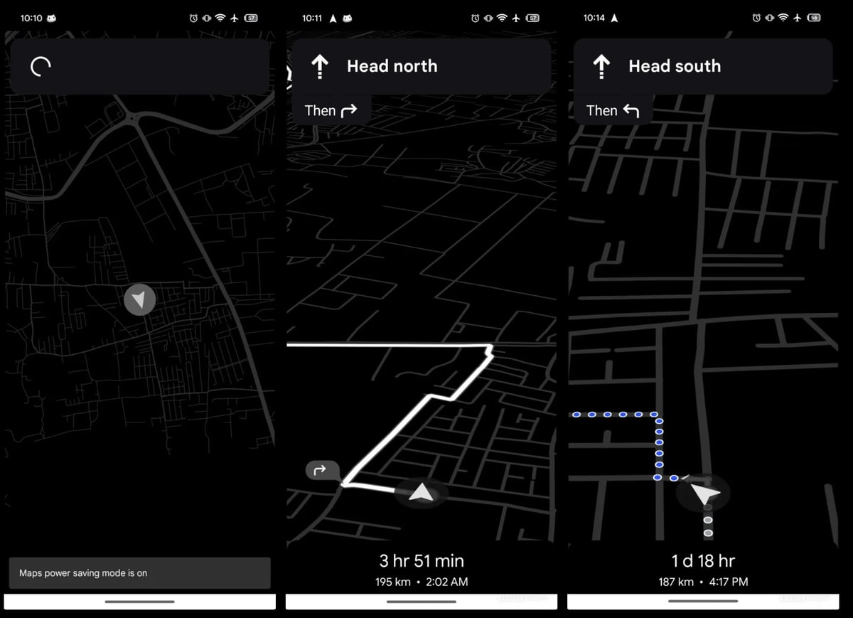Das Display wechselt in einen monochromen Modus und nahezu alle UI-Elemente verschwinden vom Bildschirm. Google scheint hier allerdings über das Ziel hinausgeschossen zu sein, denn selbst der Name der Straße, in die man als Nächstes abbiegen soll, wird offenbar nicht mehr angezeigt. Auf den aufgetauchten Screenshots ist nur noch eine stark reduzierte Ansicht zu sehen, die zwar Strom sparen dürfte, aber möglicherweise zu wenig Information bietet.