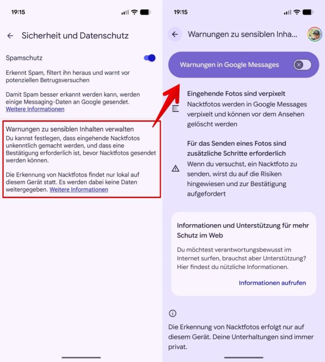 Erhält man ein Bild mit Nacktdarstellung, wird es automatisch unscharf dargestellt. Erst nach bewusster Bestätigung kann der Inhalt angesehen werden. Die Klassifizierung der Bilder findet dabei direkt auf dem Gerät statt und läuft über das Android System SafetyCore. Google versichert, dass dabei keine Daten oder Inhalte der Bilder an externe Server gesendet werden.