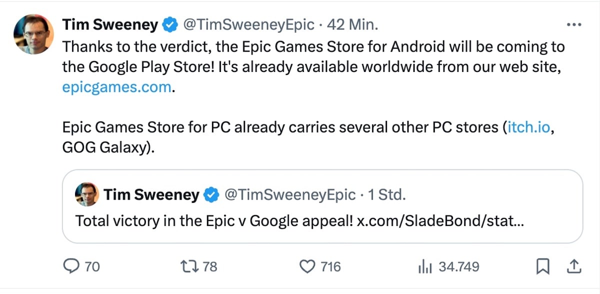 Epic-CEO Tim Sweeney kündigte nach dem Urteil an, dass der Epic Games Store für Android nun in den Google Play Store kommen wird. Google hingegen warnt durch seine Vizepräsidentin für regulatorische Angelegenheiten, Lee-Anne Mulholland, vor negativen Auswirkungen auf Nutzersicherheit und Innovation im Android-Ökosystem.