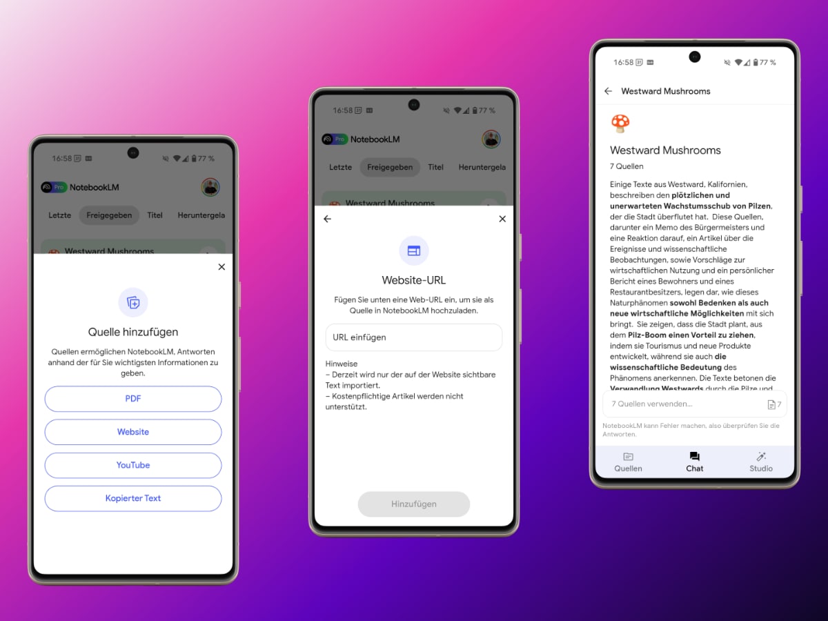 Die bekannten Funktionen der Webversion bleiben vollständig erhalten. Nutzer können wie gewohnt PDF-Dokumente hochladen, Webinhalte importieren, YouTube-Videos analysieren und Texte verarbeiten. Die Integration in das systemweite Teilen-Menü ermöglicht das direkte Übernehmen von Inhalten aus anderen Anwendungen. Die Navigation innerhalb der Notebooks erfolgt über eine untere Leiste mit den Bereichen Quellen, Chat und Studio für verschiedene Werkzeuge.