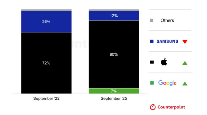 Laut den Marktforschern von Counterpoint konnte Google seine Marktanteile vor allem durch die Kooperationen mit T-Mobile und Verizon ausbauen, während man im Verbund mit AT&T eher moderat gewachsen ist. Die Reihe der Pixel 10 kommt jedenfalls in den Vereinigten Staaten gut an. Dass man ausgerechnet im September 2025 einen neuen Rekord aufstellen konnte, wirkt noch beeindruckender, wenn man im Kopf behält, dass exakt in jenem Monat Apple seine neuen iPhone 17 vorgestellt hat.