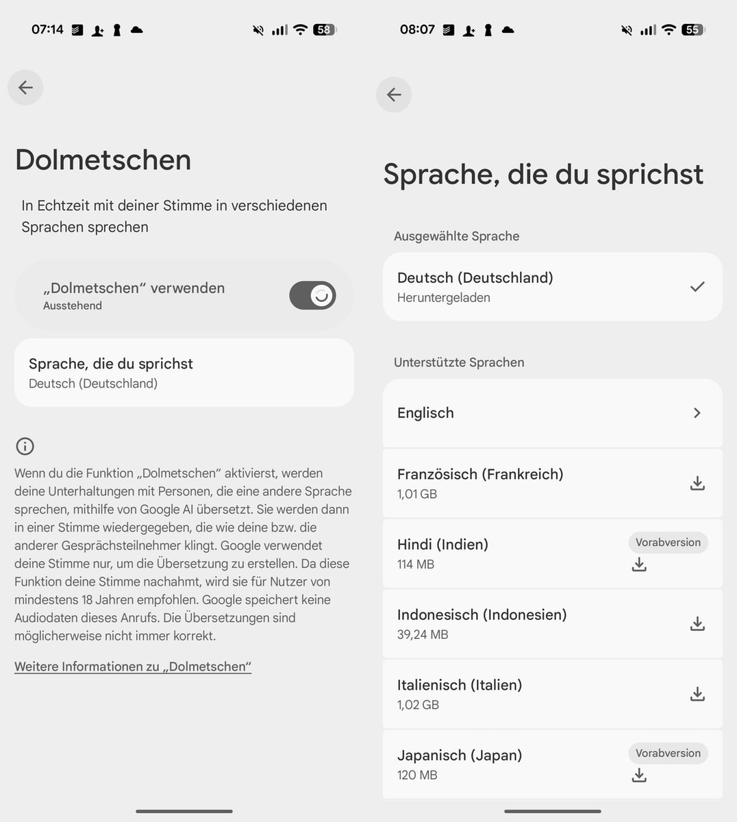 Die Technologie unterstützt neben Englisch zehn weitere Sprachen, darunter Deutsch, Französisch, Spanisch, Italienisch und Japanisch. Ein Vorteil: Die Funktion arbeitet komplett offline und speichert keine Audiodaten oder Transkripte. Die Gespräche werden weder an Google-Server übertragen noch anderweitig gespeichert. Der Nachteil: Derzeit ist es nur möglich, deutsche Gesprächspartner mit englischen zu verknüpfen (ich gehe davon aus, dass ihr Deutsch sprecht, sollte das nicht der Fall sein, solltet ihr „eure“ Sprache herunterladen).