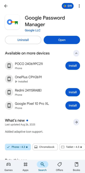 Noch braucht ihr danach allerdings nicht zu suchen, denn geschaltet ist diese Funktion noch nicht. Vielmehr konnte Android Authority das Ganze im Code der Play-Store-App in der Version 47.7.19-31 aufspüren. Generell könnt ihr zwar auch schon über den Play Store Apps von anderen Geräten entfernen, das erfordert aber etwas Suche. Denn ihr müsst dafür erst in den Unterbereich „Apps und Geräte verwalten“ und dort über einen Filter die Liste der installierten Apps auf den jeweiligen Geräten durchgehen. Da wäre ein zentraler Button mit einer Geräteauswahl direkt auf den App-Seiten im Store sicher für viele eine Erleichterung.