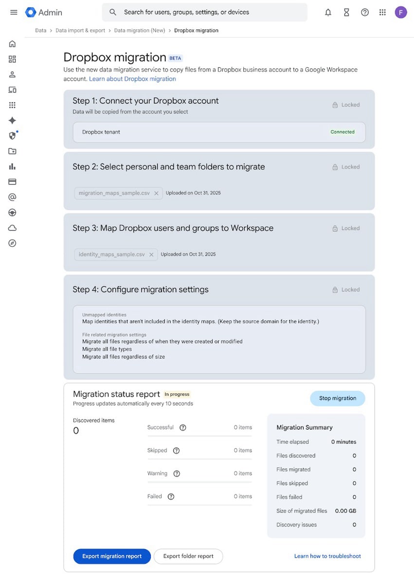 Pro Durchgang lassen sich Daten von bis zu 100 Dropbox-Nutzern oder Team-Ordnern gleichzeitig migrieren. Google hat dabei an ein vernünftiges Reporting gedacht. Admins können den Fortschritt der Migration nachverfolgen und sehen, wie viele Dateien übertragen oder übersprungen wurden. Die Reports lassen sich exportieren, falls man bei Fehlern genauer nachschauen muss. Mit dabei ist auch die Delta-Update-Funktion, mit der nachträglich hinzugefügte oder geänderte Dateien übertragen werden können.