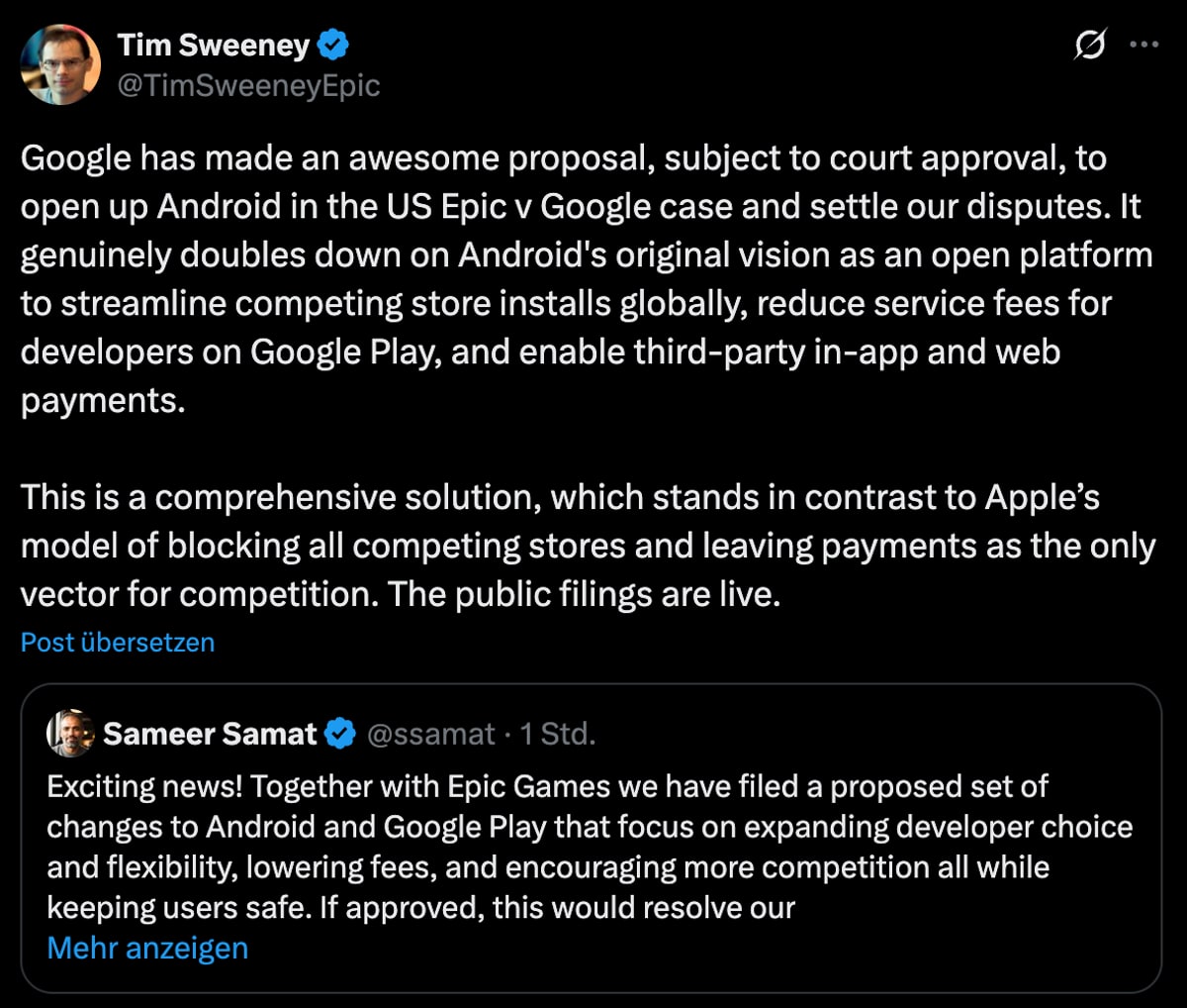Der Vorschlag sieht vor, dass Entwickler mehr Wahlfreiheit bekommen und die Gebühren im Google Play Store gesenkt werden. Außerdem sollen Drittanbieter-Zahlungssysteme sowohl in Apps als auch über Webzahlungen möglich werden. Epic-Chef Tim Sweeney zeigt sich begeistert und spricht davon, dass Google damit zur ursprünglichen Vision von Android als offene Plattform zurückkehrt. Ob das Gericht dem Vorschlag zustimmt, bleibt abzuwarten. Die Einigung würde aber den jahrelangen Streit zwischen Google und Epic endlich beenden und könnte das Android-Ökosystem sicherlich verändern. Mal schauen, was noch an Details herauskommt.