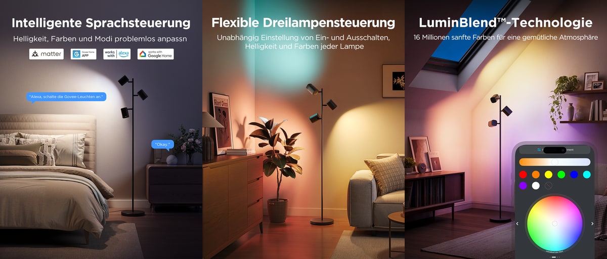 Alle Modelle lassen sich über die Govee-Home-App steuern und sind kompatibel mit Amazon Alexa sowie Google Assistant. Durch die Matter-Integration (über WiFi) fügen sich die Leuchten nahtlos in bestehende Smart-Home-Systeme ein, ich setze ja auf Apple Home und kann durch Matter die Lampe durchschleifen.