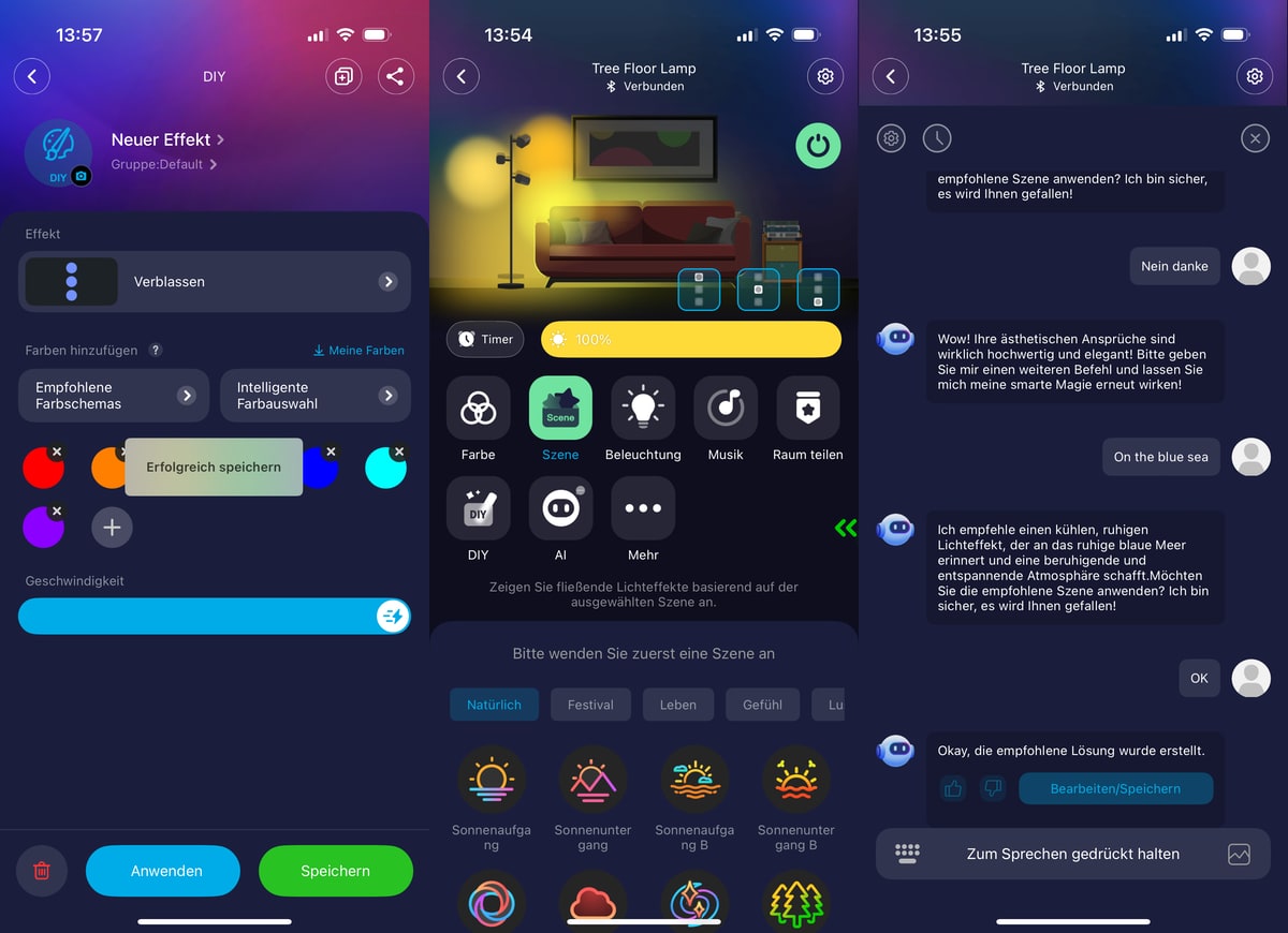 Für den Neuling kann das Ganze erst einmal zu wuselig wirken. Szenen, Einzelsegmente, dies das eben. Immerhin: Govee hat schon das an Bord, was Philips Hue bei uns erst bekommt: einen Assistenten. Dem erzählt ihr auf Englisch, was ihr euch vorstellt – und dann baut er euch ein Beleuchtungs-Setup.