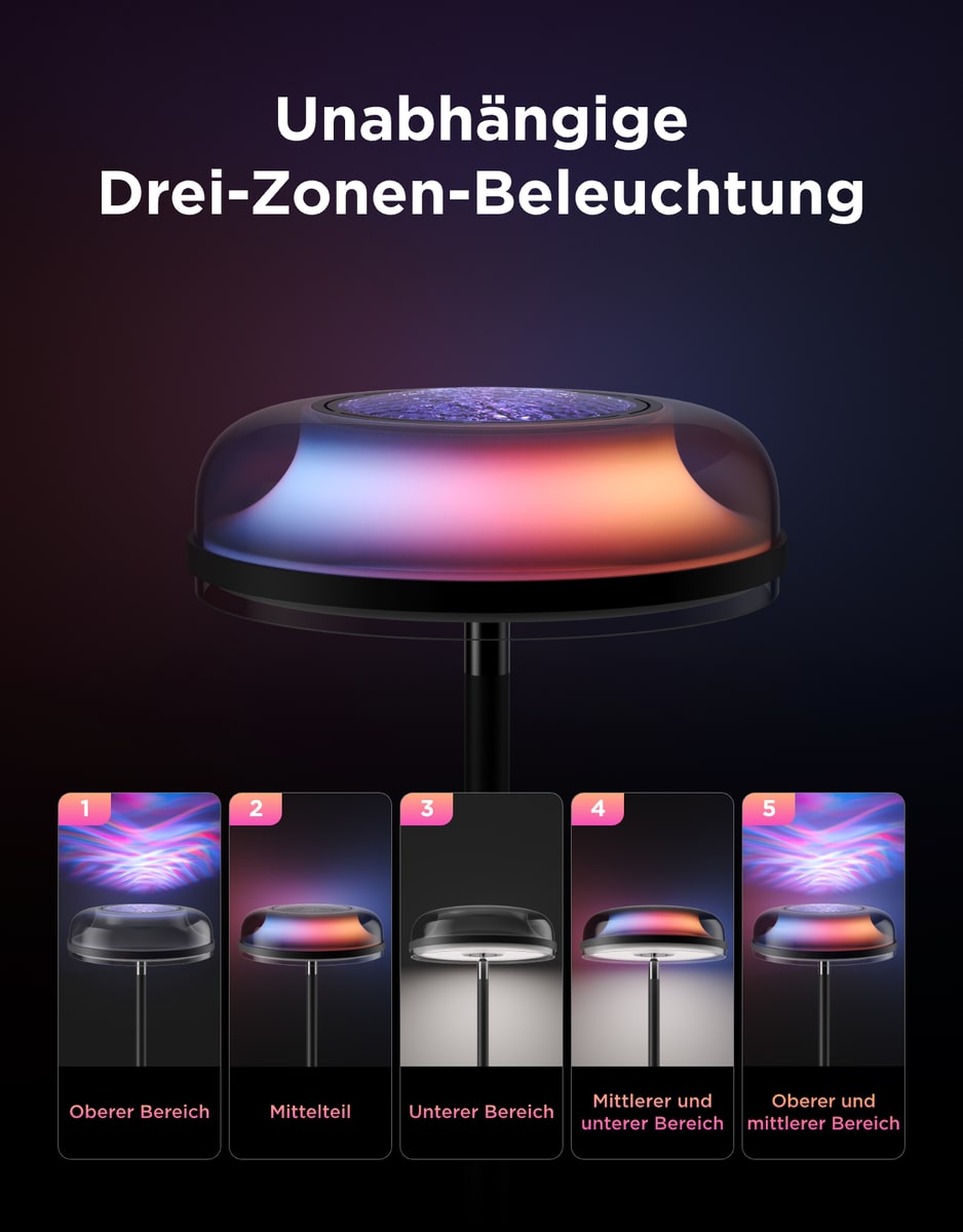 Neben dem Spitzenmodell erweitert Govee das Sortiment um die Uplighter Floor Lamp und die Torchiere Floor Lamp. Der Uplighter ist ein Drei-in-eins-Konzept mit Deckenfluter, RGBIC-Mittelteil und einer 1.000 Lumen starken Arbeitsbeleuchtung im unteren Segment: