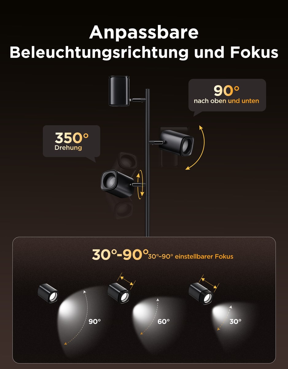Die Tree Floor Lamp ermöglicht durch ihre flexible Konstruktion eine präzise Ausrichtung des Lichts. Jeder Leuchtkopf lässt sich horizontal um 350° und vertikal um 90° drehen.