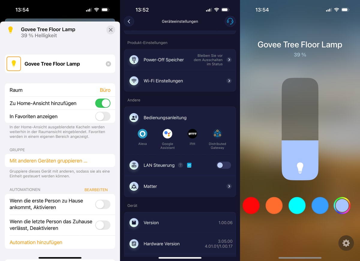 Alle Modelle lassen sich über die Govee-Home-App steuern und sind kompatibel mit Amazon Alexa sowie Google Assistant. Durch die Matter-Integration (über WiFi) fügen sich die Leuchten nahtlos in bestehende Smart-Home-Systeme ein, ich setze ja auf Apple Home und kann durch Matter die Lampe durchschleifen.