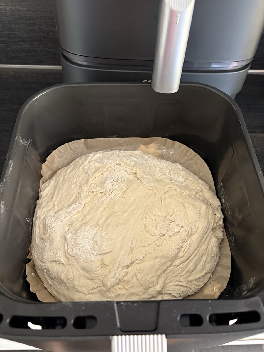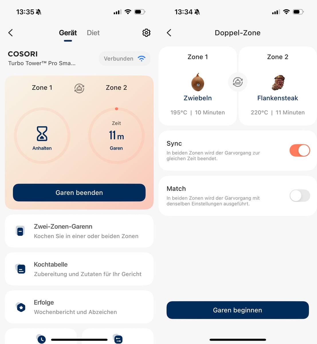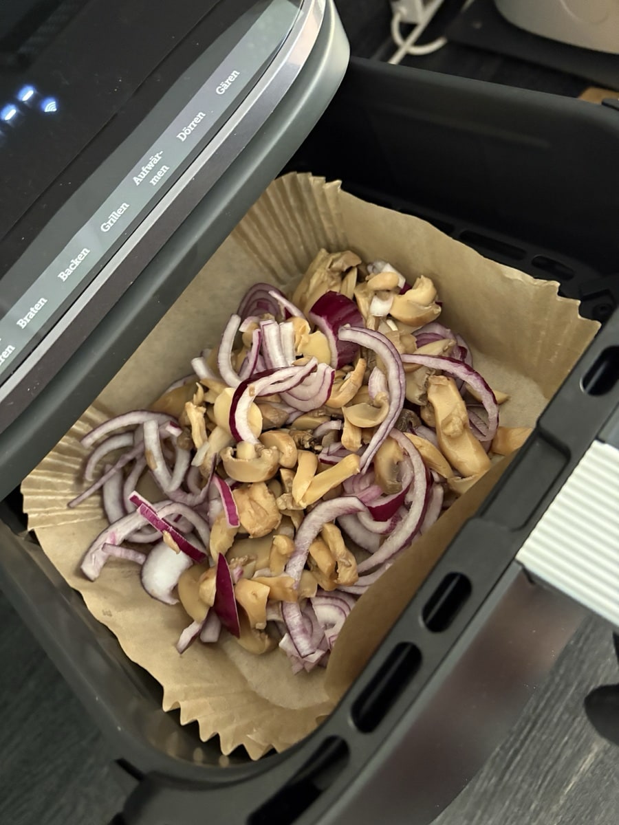 Was cool ist: Es gibt eine Sync & Match Funktion: Mit dieser Funktion können die Garzeiten für beide Körbe synchronisiert werden, sodass unterschiedliche Speisen mit unterschiedlichen Garzeiten gleichzeitig fertig werden. Man stellt einfach die benötigten Zeiten ein, und das Gerät passt den Start des kürzeren Garvorgangs an. Großartige Fotos von unseren Speisen erspare ich euch mal hier.
