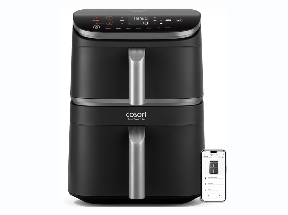 Ist natürlich Quatsch, die Kisten gibt es schon ewig und letzten Endes sind es praktische, kleine, aber oft glorifizierte Heißluftöfen. Auch wir haben seit Jahren solche Geräte im Einsatz, manches geht eben fixer, ist praktischer oder einfacher zu reinigen. Manches Mal wurde uns aber der bisherige Xiaomi-Airfryer zu klein, sodass ich letztes Mal zum Cosori Turbo Tower Pro Smart griff. Smarter, größer und auch im Angebot (gabs mit 70 Euro Rabatt, ansonsten 350 Euro).