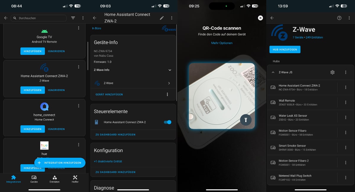 Nach der Instanz-Installation geht auch das Anlernen von Geräten problemlos und schnell. Das ist mit meiner Bestands-Hardware von Fibaro oder Abus wie bei anderen Zentralen möglich (wenngleich etwas uneinheitlich). Z-Wave hat da aber wohl inzwischen dran gearbeitet und so unterstützten ein Wasserleck-Sensor sowie eine Remote aus dem Hause Zooz das bequeme Anlernen per QR-Code.