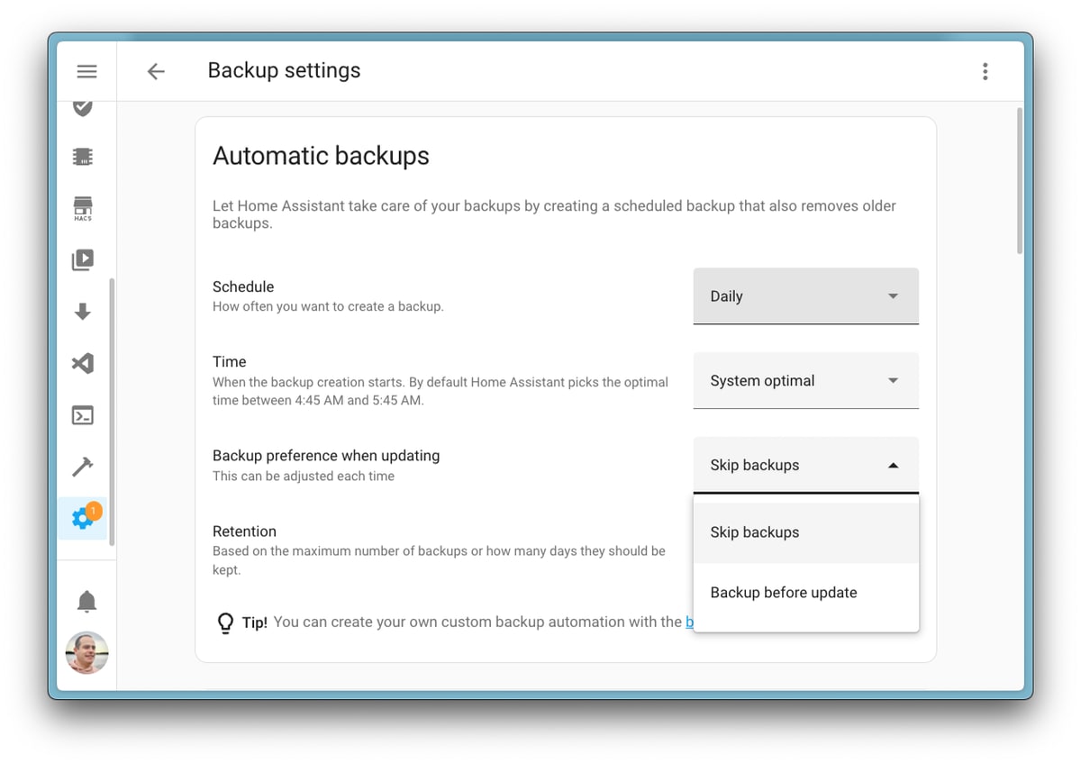 Es lässt sich für obige Option eine Standard-Präferenz festlegen. So kann man das Standardverhalten in den Backup-Einstellungen mit der Option „Backup vor dem Upgrade“ festlegen. Zudem wartet der Home Assistant während einer laufenden Sicherung nun deren Ende ab, bevor er einen Neustart durchführt. So wird ein versehentliches Abbrechen der Sicherung durch den Neustart verhindert.