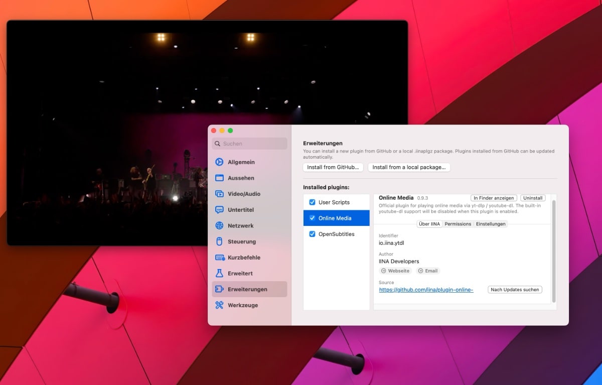 Nutzer können damit die Funktionen von IINA durch JavaScript-Plugins erweitern. Bereits in der Beta vor ein paar Monaten waren erste Beispiele enthalten: Ein Online-Media-Plugin ermöglicht das Herunterladen von Videos von YouTube und anderen Plattformen während der Wiedergabe. Mit dem OpenSubtitles-Plugin lassen sich passende Untertitel suchen und einbinden.