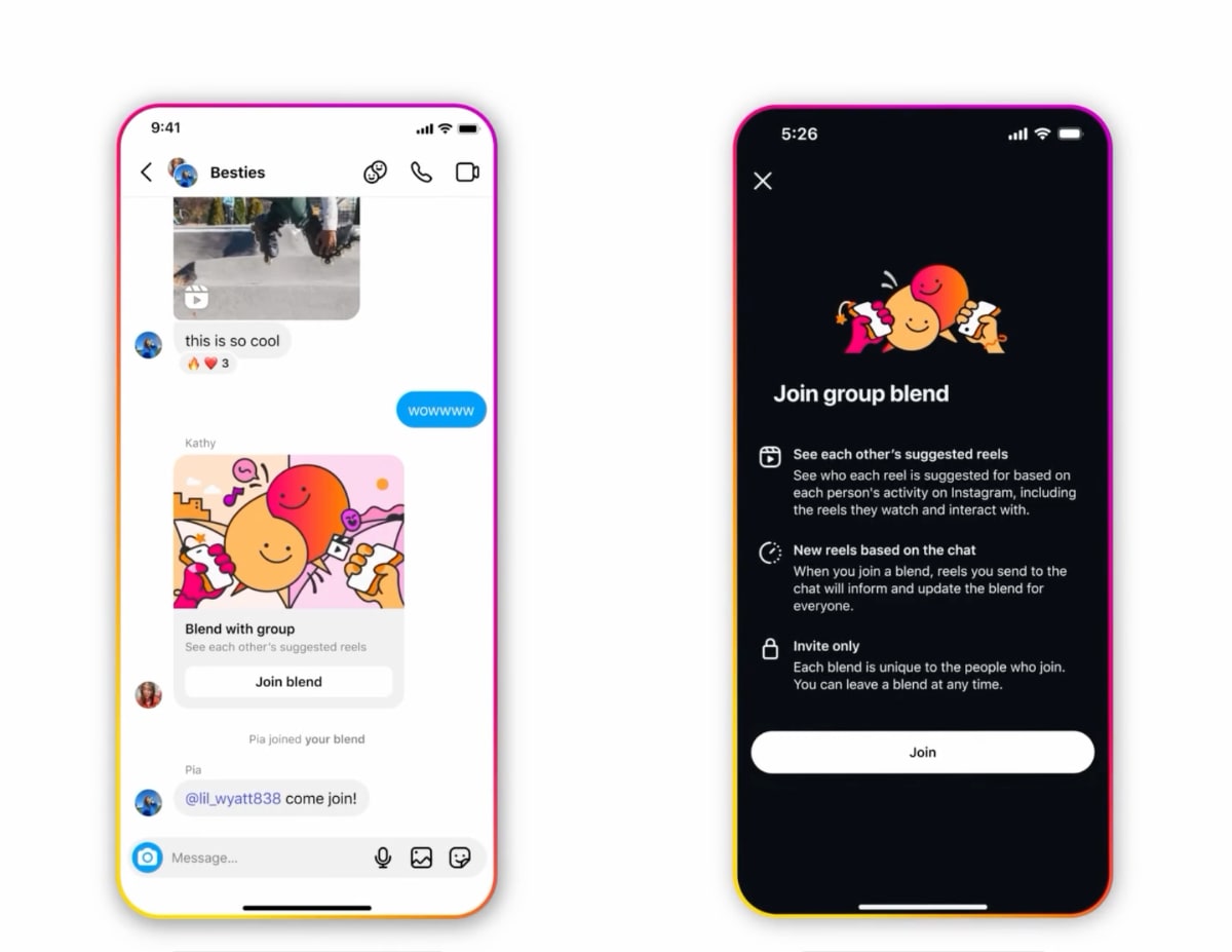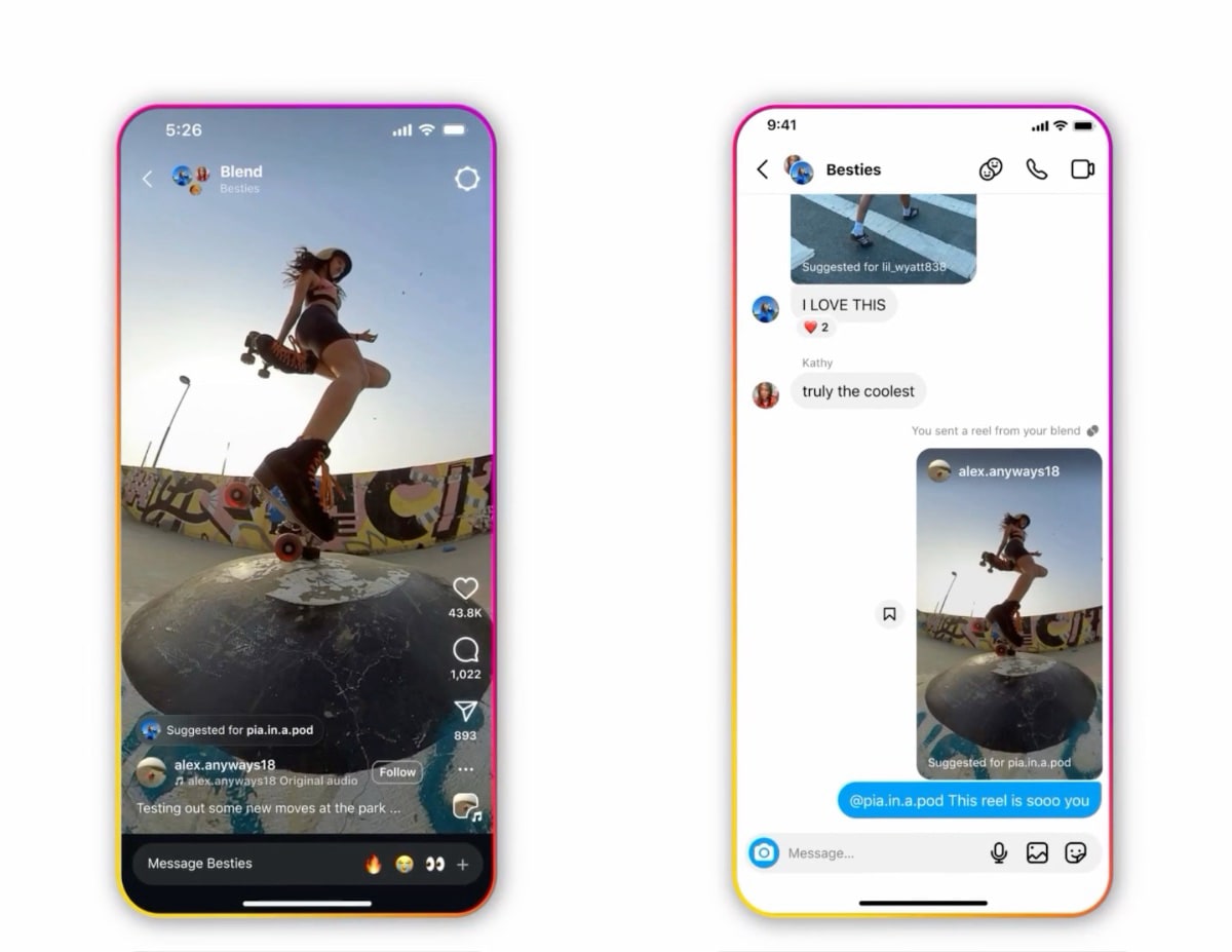 Instagram bringt mit der Funktion „Blend“ eine neue Art zum Konsumieren von Reels an den Start. Blend ist hierbei ein gemeinsamer Feed von Reels, der Empfehlungen für eine komplette Freundesgruppe kombiniert. Jeder der Freunde muss einer Teilnahme zustimmen. Um einen Blend mit einem Freund oder einer Freundesgruppe zu starten, drückt man auf das Blend-Symbol in der DM (Privatnachricht oder Gruppenchat).