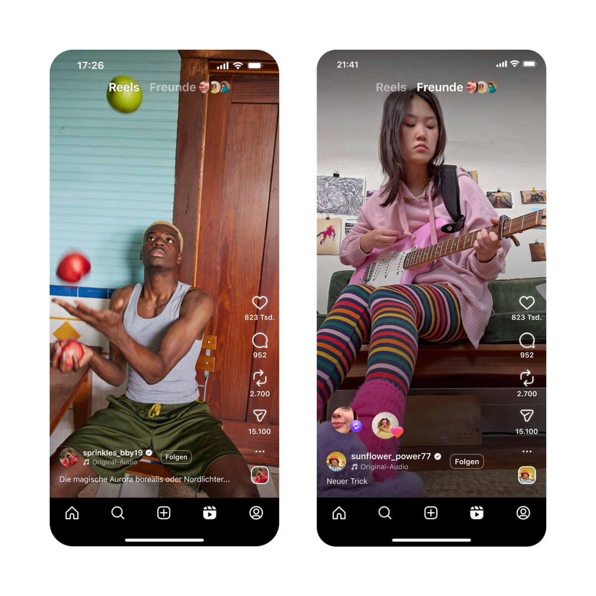 Der Friends-Tab zeigt euch Reels, die von euren Freunden erstellt wurden, oder mit denen diese interagiert haben. Eine Interaktion kann mittels Likes, Kommentaren oder auch Reposts geschen. Die Inhalte bieten oftmals Ausgangspunkt für neue Unterhaltungen und können daher auch direkt kommentiert werden.