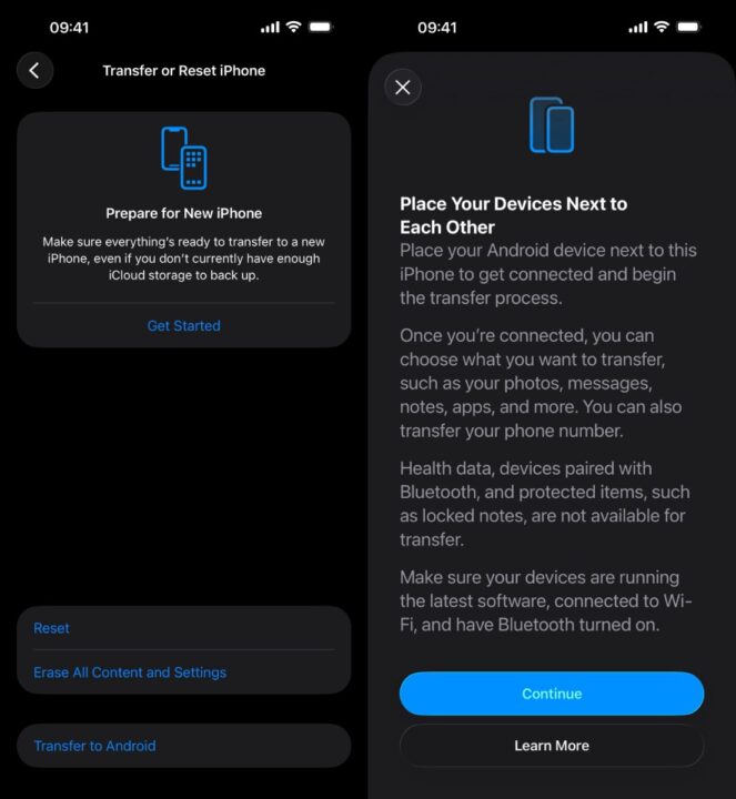 Fangen wir bei dem Transfer eurer iPhone-Daten hin zu einem Android-Telefon an. Da gibt es in den Einstellungen eine neue Option, die den Übergang erleichtern soll. Ihr platziert das iPhone direkt neben dem zukünftigen Androiden und beginnt den Prozess. Dann ist noch ein QR-Code zu scannen und schon werden die wichtigsten Daten (nicht alles wie bspw. Health) übertragen. Keine separate App mehr möglich. Google hat ein ähnliches Feature implementiert, um den Übergang zum iPhone einfacher zu machen.