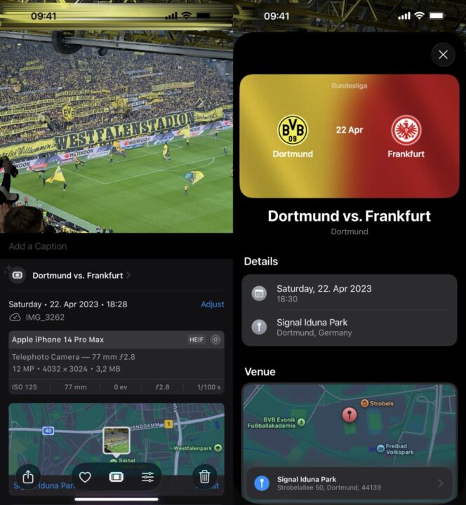Für Konzerte zeigt die App jetzt Setlists, Künstler, Infos zur Location, passende Playlists und auch kommende Events an. Bei Sportveranstaltungen gibt es ebenfalls mehr Informationen wie ein Scoreboard, den Veranstaltungsort und weitere Termine. Das Scoreboard wird bei einigen Spielen bei mir geladen, bei anderen nicht (siehe Frankfurt im Screenshot). Da wird Apple sicher noch nachbessern – ist halt eine Beta.