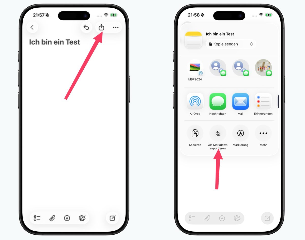 Neu ist auch der Export im Markdown-Format, wodurch sich Notizen als .md-Dateien in Drittanbieter-Apps importieren lassen. Das erfolgt über das Teilen-Menü einer Notiz.
