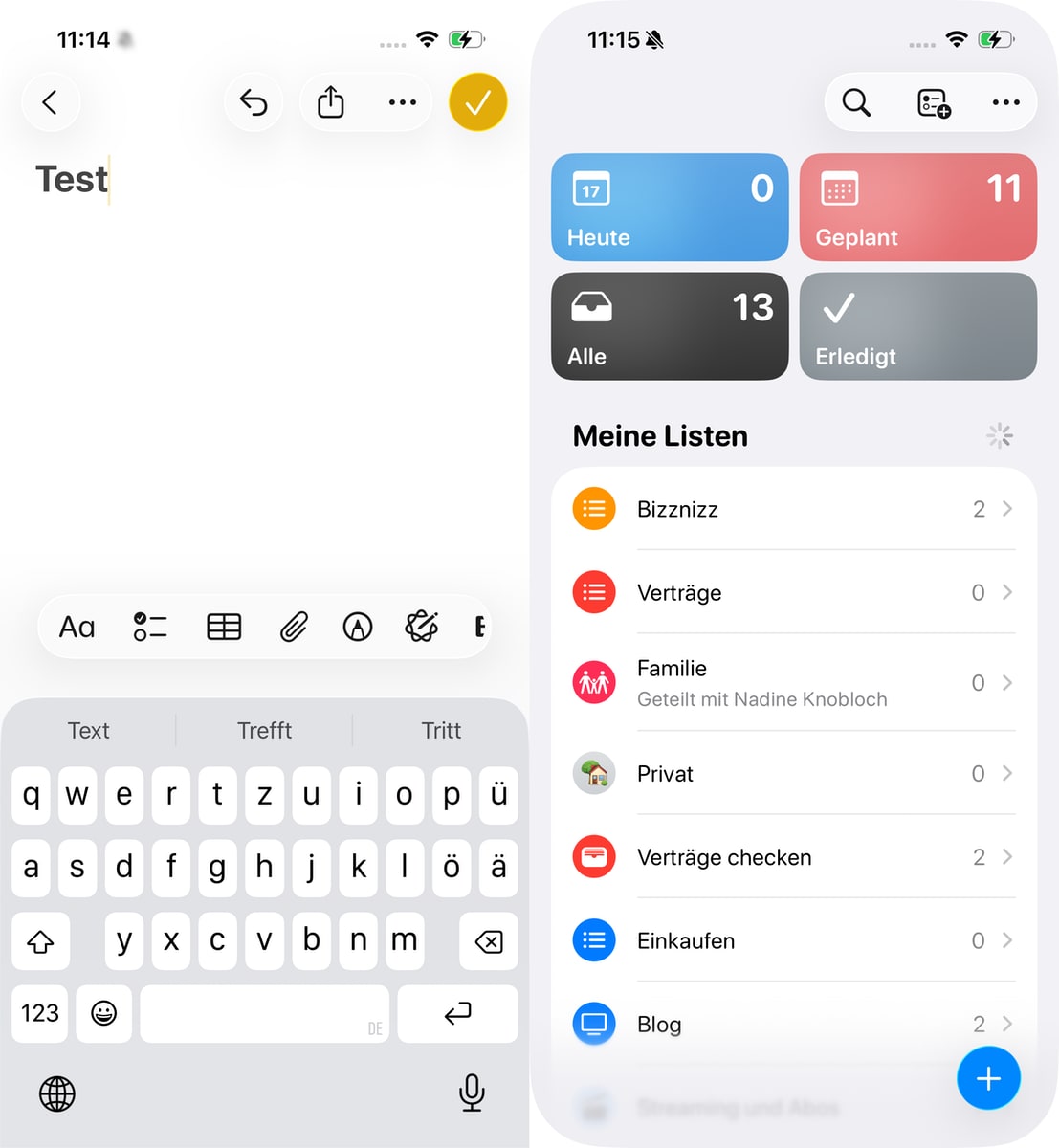 Die Benutzeroberfläche zeigt sich in der Notiz-App durch eine kompaktere Toolbar und abgerundeter Tastatur, während in den Erinnerungen die verschiedenen Bereiche jetzt in Vollfarbe statt in Weiß erscheinen.