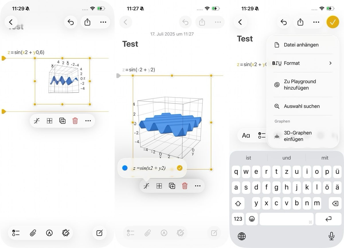Die Notiz-App unterstützt in iOS 26 die Erstellung von 3D-Graphen mit drei Variablen. Durch Eingabe einer Gleichung wie z=sin(x2 + y0,5) entstehen grafische Darstellungen, die sich per Gesten anpassen lassen. Auf dem iPad funktioniert dies auch mit handschriftlich eingegebenen Gleichungen. Auf dem iPhone ist das alles gut machbar, das Bewegen des Graphen sollte aber behutsam geschehen.