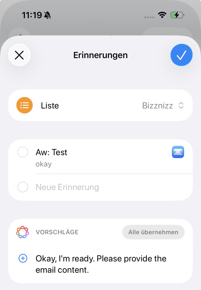 In den Erinnerungen führt Apple neue KI-gestützte Funktionen ein, die allerdings ein Gerät mit Apple Intelligence voraussetzen. Die Siri-Vorschläge analysieren Konversationen aus Mail und Nachrichten und schlagen automatisch neue Aufgaben vor. Diese kontextbezogenen Vorschläge lassen sich direkt aus anderen Apps wie Mail mit einem Tippen als Erinnerung übernehmen, dazu muss der Inhalt mit der Erinnerungen-App geteilt werden. Funktioniert mal mehr, mal weniger gut: