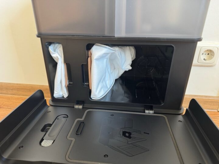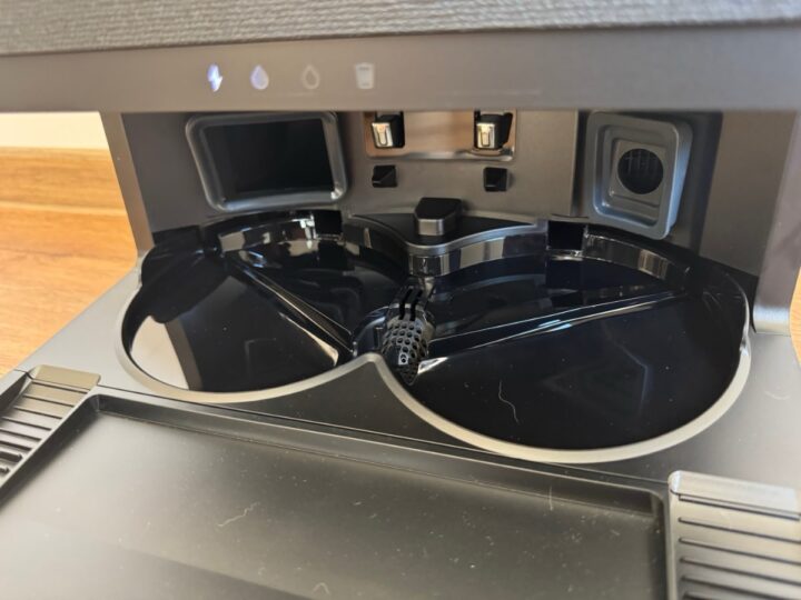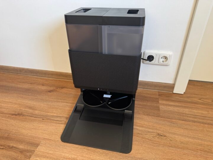 Das neue Dock ist ebenfalls komplett überarbeitet. Es übernimmt nicht nur das Aufladen, sondern auch die automatische Entleerung des Staubbehälters, das Waschen und Trocknen der Mopp-Pads sowie das Nachfüllen des Wassertanks. Leider geht dem Dock jegliche Wertigkeit komplett ab. Setzte man früher noch auf Teile mit Holz, die sich edel ins Wohnzimmer-Design fügten, prangt hier nun ein Teil mit zwei komplett sichtbaren Wasserbehältern und einer angerauten Klappe, die keine Wertigkeit vermittelt. Schade.