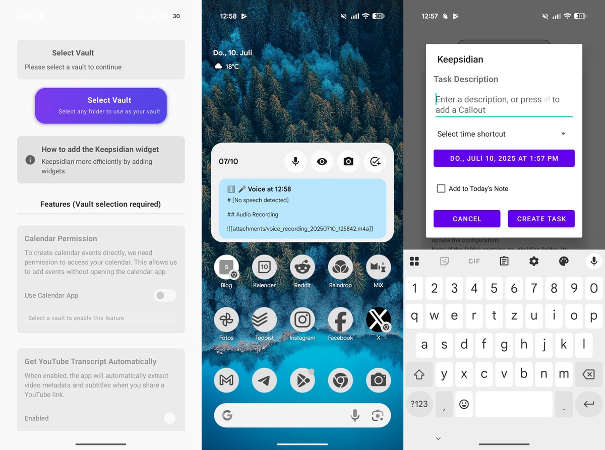 Die App bietet ein Widget für den Homescreen, über das Nutzer ohne Umwege Notizen, Sprachmemos und Screenshots direkt in ihr Obsidian-Vault einfügen können. Das funktioniert auch offline, eine Cloud-Anbindung oder ein Login sind nicht erforderlich. Die erfassten Inhalte werden automatisch in der Tagesnotiz gespeichert und erscheinen dort mit korrekter Markdown-Formatierung.
