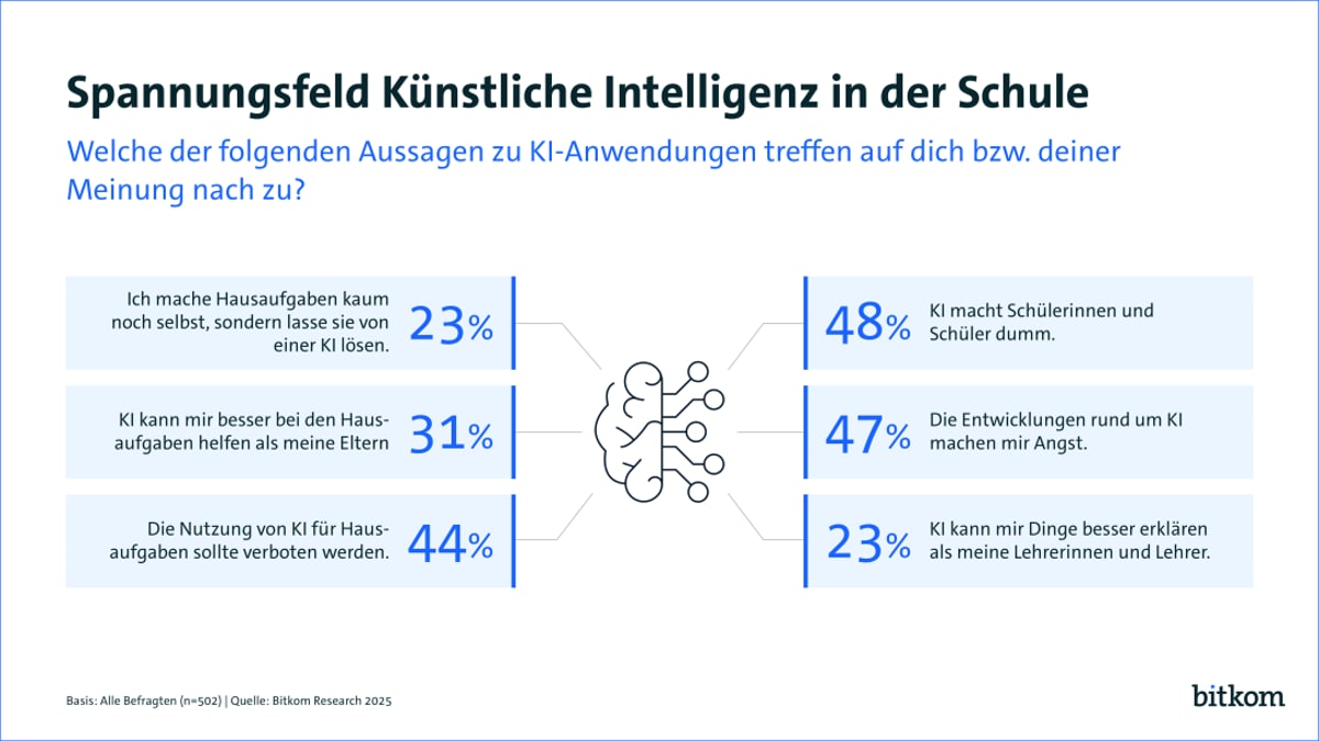 Eine aktuelle Bitkom-Studie zeigt ein eher trauriges Bild der KI-Nutzung an deutschen Schulen. Die Befragung unter 502 Schülerinnen und Schülern im Alter von 14 bis 19 Jahren offenbart, dass bereits 23 Prozent ihre Hausaufgaben weitgehend von Künstlicher Intelligenz erledigen lassen. Diese Entwicklung spaltet die Schülerschaft: Während knapp über die Hälfte einen positiven Effekt auf ihre schulischen Leistungen sieht, befürchten 48 Prozent negative Auswirkungen auf ihre kognitiven Fähigkeiten.