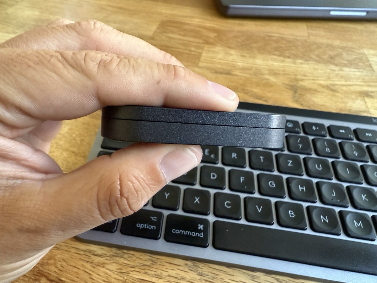 Darüber hinaus zeichnet sich das Modell zumindest optisch durch ein kompaktes Design aus, das es im Vergleich zur Vorgängerversion schlanker macht. Der Hersteller setzt auf USB-C 3.2, was ja eigentlich schon ein Muss ist. Lustig: Amazon schreibt, dass es sich um ein robustes, stoßfestes Aluminiumgehäuse handelt. Der Deckel hört sich beim Draufklopfen so dünn und hohl an, dass man denken möchte, es handelt sich um dünnes Plastik. Positiv zu erwähnen ist, dass die portable SSD wirklich leicht und klein ist – sie wiegt 42 Gramm und ist kleiner als eine Kreditkarte. Die Box enthält neben der SSD 1x Typ-C-auf-Typ-C- und 1x USB-3.2-auf-Typ-C-Kabel.