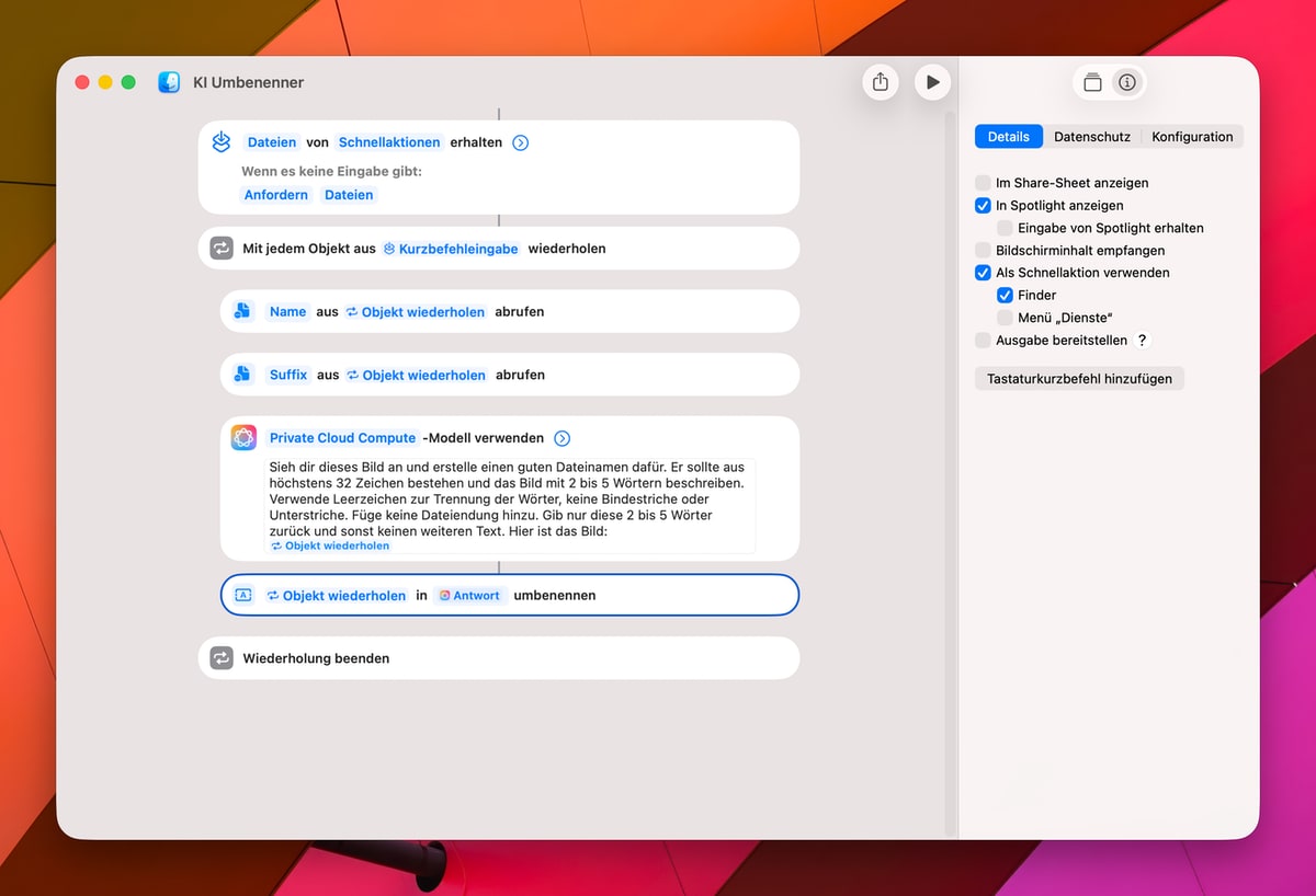 Bearbeiten könnt ihr eure Prompts ja noch selbst, vielleicht bekommt ihr noch bessere Antwortmöglichkeiten für eure Bilder heraus. In Kurzform: Der Kurzbefehl lässt sich in das Kontextmenü > Schnellaktionen einklinken und erlaubt so das flotte Umbenennen von Bildern mittels KI (die von Apple oder ChatGPT, könnt ihr ja mal rumspielen).