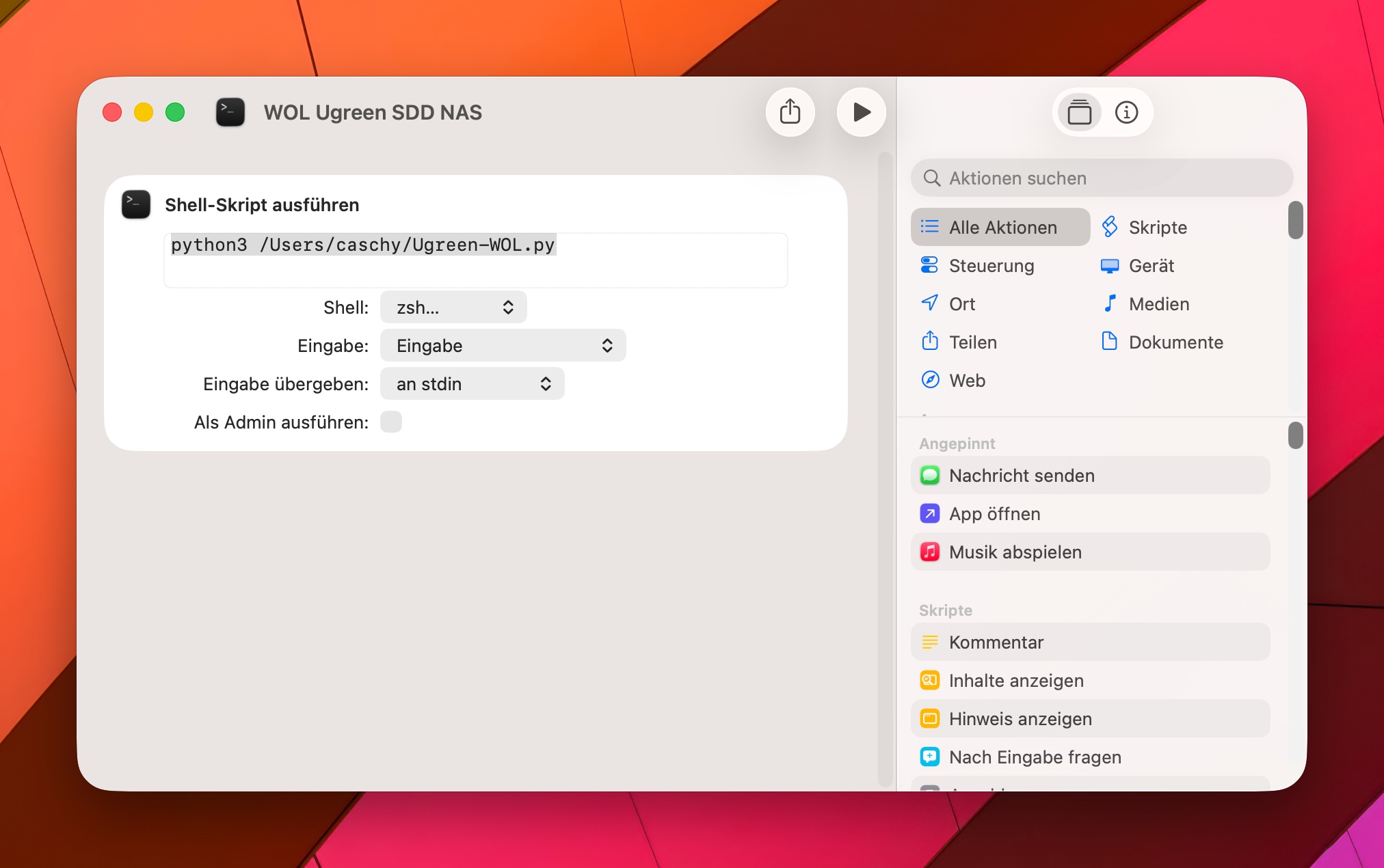 Wer – wie ich – faul ist, tippt das natürlich nicht jedes Mal. Erstellt einen neuen Kurzbefehl, wählt „Shell-Skript ausführen“ und kopiert den Befehl python3 nebst Pfadangabe zum Script dort rein. Das könnt ihr euch dann sogar in die Menüleiste legen oder per Spotlight aufrufen.
