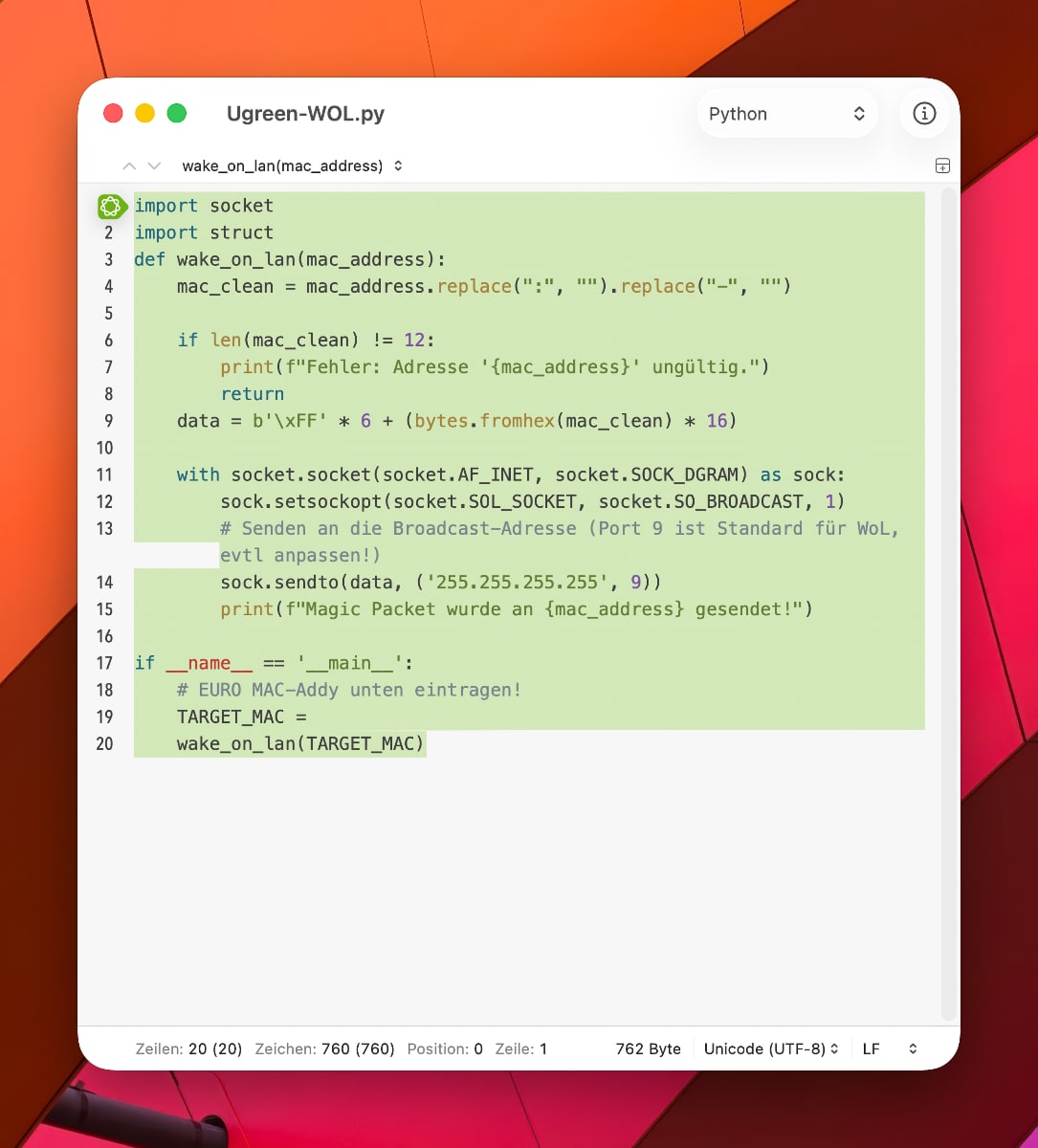 Klar, ein Blick in den App Store von macOS 26 (Tahoe) zeigt Dutzende Apps für „Wake on LAN“ (WoL). Die sind oft bunt, manche kosten sogar Geld und sind viel zu viel. Muss das sein für eine Funktion, die eigentlich nur ein simples Datenpaket verschickt? Ich sage mal: Nein. Da wir unter macOS Python quasi „ab Werk“ an Bord haben, lässt sich das Ganze mit einem winzigen Skript erledigen. Das ist für mich sauberer, braucht keine Updates und lässt sich wunderbar in die Kurzbefehle-App oder in Automatisierungen einbinden.