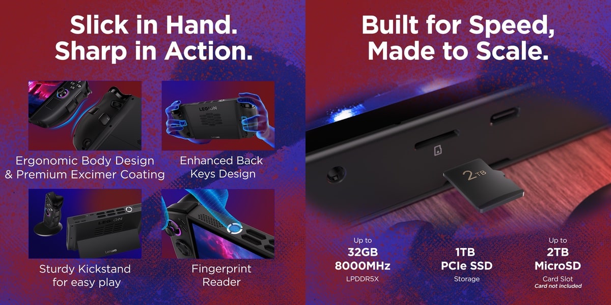 Die abnehmbaren „Legion Truestrike“-Controller wurden überarbeitet und bieten nun sechs programmierbare Tasten, zwei an der rechten Controllerkante und vier auf der Rückseite. Neu ist auch ein Fingerabdrucksensor im Power-Button. Wie beim Vorgänger lässt sich das Gerät im Tablet-, Konsolen- und FPS-Modus nutzen.