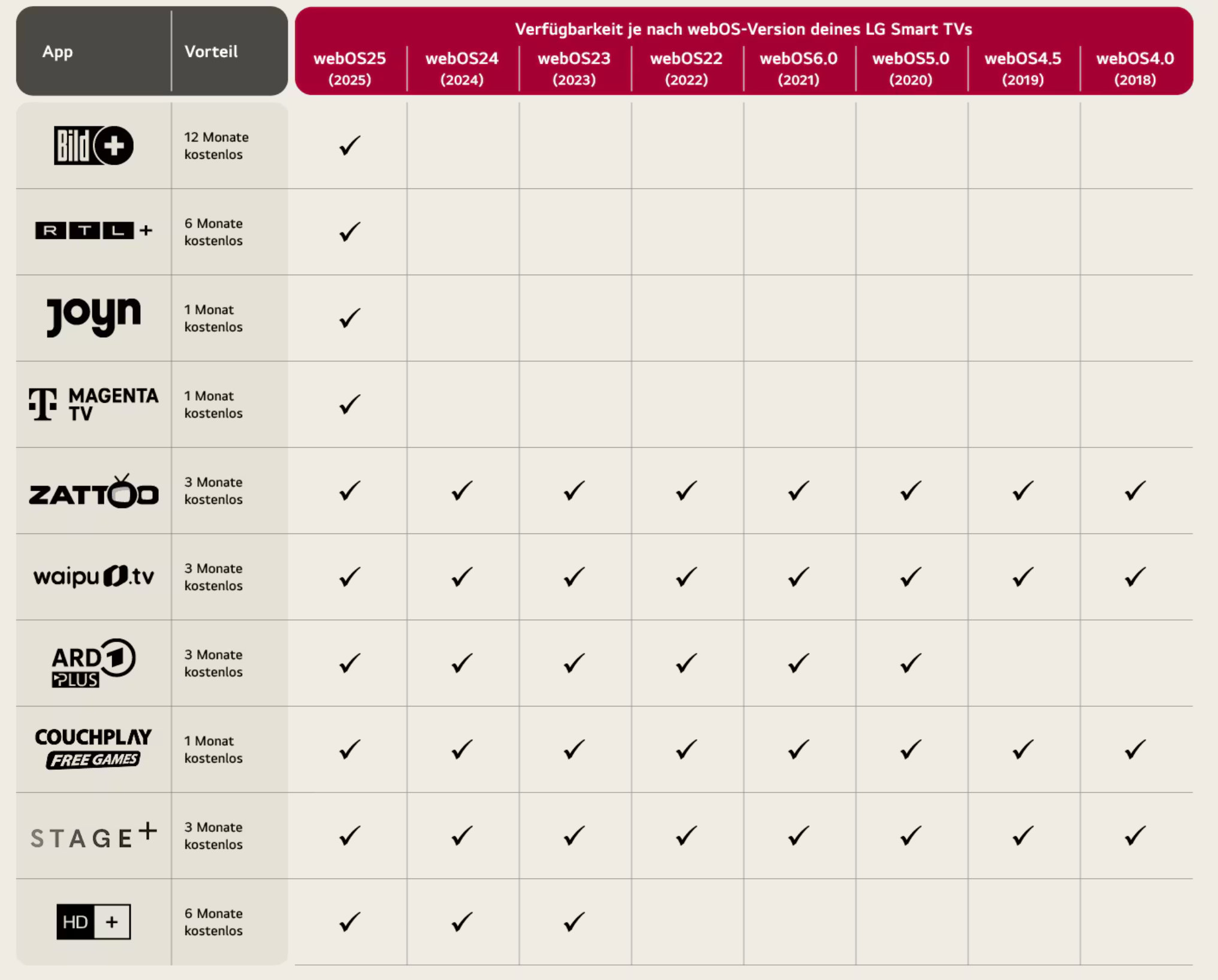 Zu beachten: Nicht alle Deals stehen an allen Modellreihen zur Verfügung. Die Aktion von Bild+ ist etwa auf die neuesten Smart-TVs mit webOS 25 beschränkt. Das Ganze seht ihr auch oben nochmal aufgeschlüsselt im Screenshot. Ebenfalls solltet ihr daran denken, die jeweiligen Probe-Abos auch rechtzeitig wieder zu kündigen. Sonst gehen sie nämlich automatisch in kostenpflichtige Tarife über und ihr werdet zur Kasse gebeten. Vielleicht ist da ja etwas für euch dabei? Bestandskunden gucken im Übrigen natürlich in die Röhre, habt ihr also ein laufendes Abonnement, dann bringen euch die Aktionen bedauerlicherweise nichts.