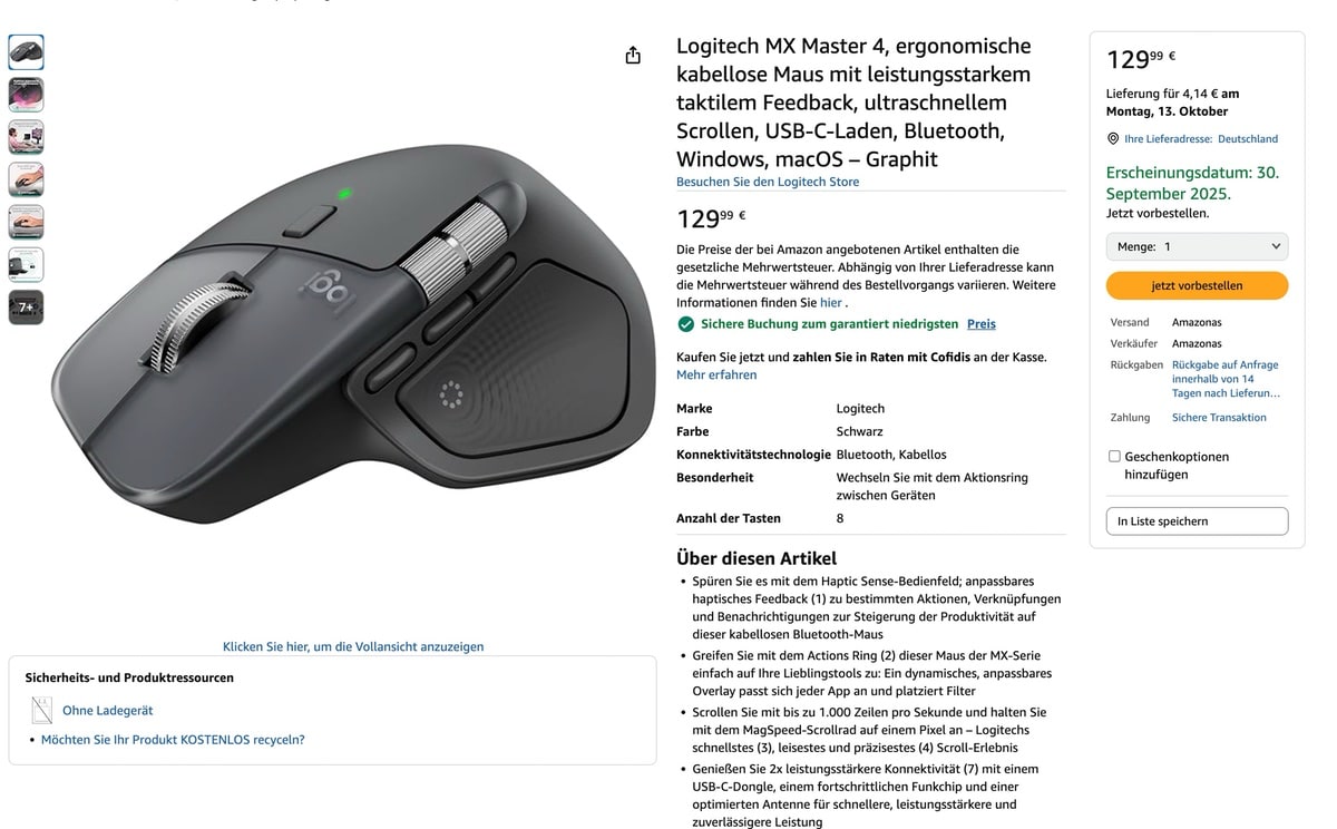 Die nächste Generation der MX-Master-Serie von Logitech steht bekanntlich in den Startlöchern. Bei Amazon Italien wurde die bisher nicht offiziell angekündigte MX Master 4 bereits gelistet. Der Produkteintrag zeigt die neue Premium-Maus mit einigen Neuerungen.