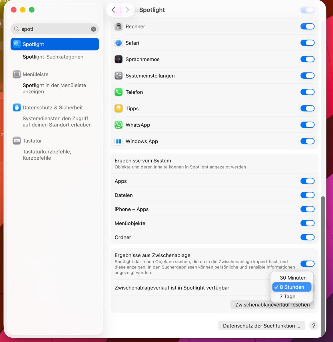 Apple hat mit macOS 26.1 eine kleine, aber praktische Änderung an der Zwischenablage vorgenommen. Nutzer können den Verlauf der Zwischenablage jetzt auf bis zu sieben Tage einstellen, statt wie bisher auf die standardmäßigen acht Stunden beschränkt zu sein. Die Funktion wurde offenbar still und leise mit dem gestrigen Update ausgerollt. Wer regelmäßig mit kopierten Inhalten arbeitet und diese auch nach längerer Zeit noch benötigt, dürfte sich über die erweiterte Speicherdauer freuen. In den Systemeinstellungen im Bereich Spotlight lässt sich die Dauer nun anpassen. Über die neuen Möglichkeiten von Spotlight hatte ich ja bereits berichtet.