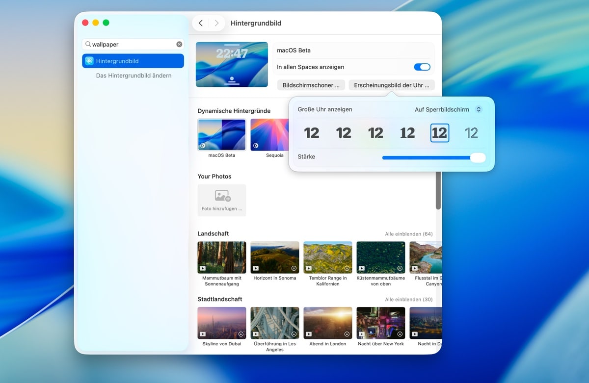 Nischen-News: Ein neues Feature findet seinen Weg in macOS 26, das Apple unter dem Codenamen „Tahoe“ entwickelt. Die Nutzer erhalten erstmals die Möglichkeit, das Design der Uhr auf dem Sperrbildschirm zumindest etwas nach ihren Wünschen anzupassen. Nutzer können zwischen verschiedenen Darstellungsformen wählen. Das kennen einige sicher schon von iOS, wobei die in macOS enthaltene Funktion schon beschränkter ist, wie mein Screenshot sicherlich zeigt (das Ganze ist mittlerweile unter „Hintergrund“ zu finden. Für Entwickler steht die erste Beta-Version bereits zur Verfügung. Die öffentliche Beta-Phase wird vermutlich im Sommer starten. Wie üblich empfiehlt es sich, Beta-Versionen nicht auf produktiv genutzten Geräten zu installieren.