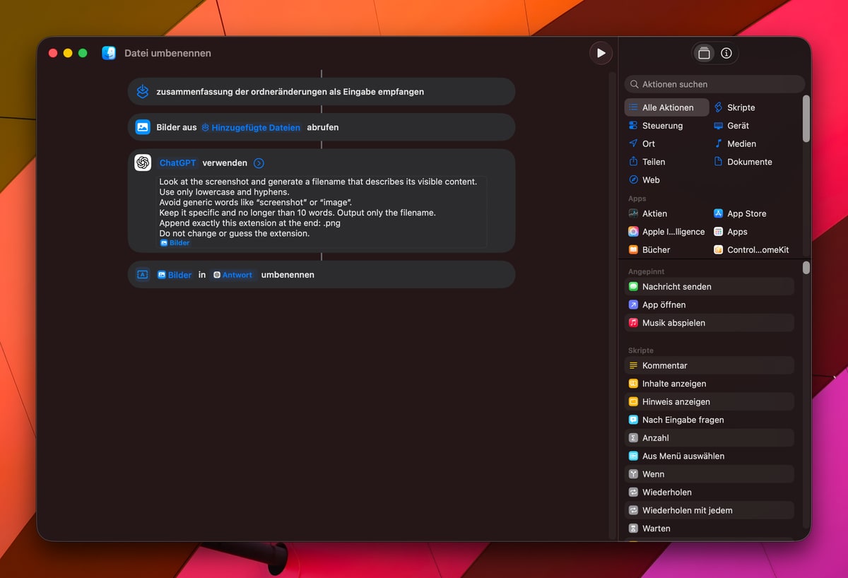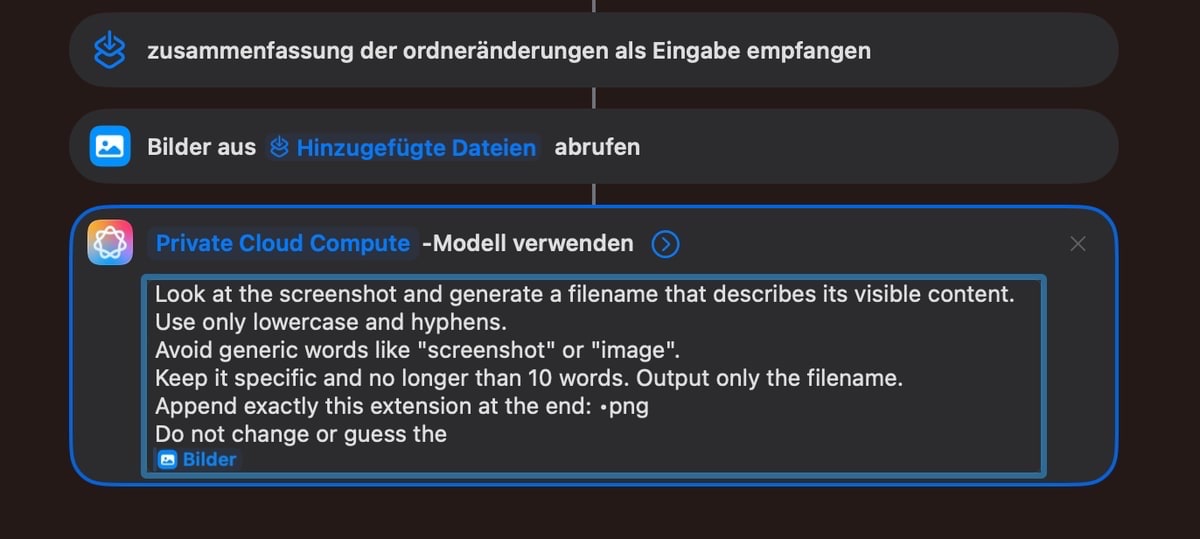 Ein paar Stolpersteine gibt es. KI neigt dazu, kreativ zu werden, wenn der Prompt zu offen ist. Ohne Begrenzung landet man schnell bei halben Sätzen als Dateinamen. Knackige Vorgaben halten das Ergebnis im Rahmen. Die Automation überwacht außerdem immer nur einen Ordner, wer verschiedene Ziele für unterschiedliche Screenshot-Typen nutzt, braucht mehrere Automationen. Während der Kurzbefehl läuft, sollte man Dateien nicht wild verschieben, weil Kurzbefehle und manuelle Aktionen sonst durcheinander geraten können. Es kann auch immer nur eine Datei zurzeit umbenannt werden, schiebt da also nicht x Bilder auf mal in den Ordner.